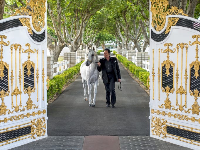 The new tour of the property begins across the street at the visitor center with a 15-minute video in the theater, tucked into the gift shop, to brush up on all things Mr. Las Vegas. Next, guests board the shuttles to enter the compound through the massive, opulent gates. "Opulent " is a word that'll pop up frequently throughout the approximately two-hour experience — whether it's inside his private jet, meandering down the museum's aisle of cars from Newton's prized collection, or on the grounds themselves: 52 acres that includes the Aramus Arabian horse stable, complete with a swimming pool for the horses. And we haven't even gotten started on the mansion.